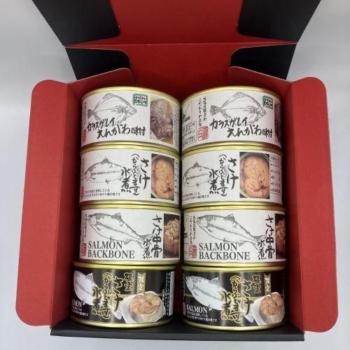 北海道で取れるさけのまるごと使用したさけ缶のセットです。カルシウム豊富なさけ中骨の缶詰は皮も綺麗にとりホロホロとした骨がおいしい缶詰です。